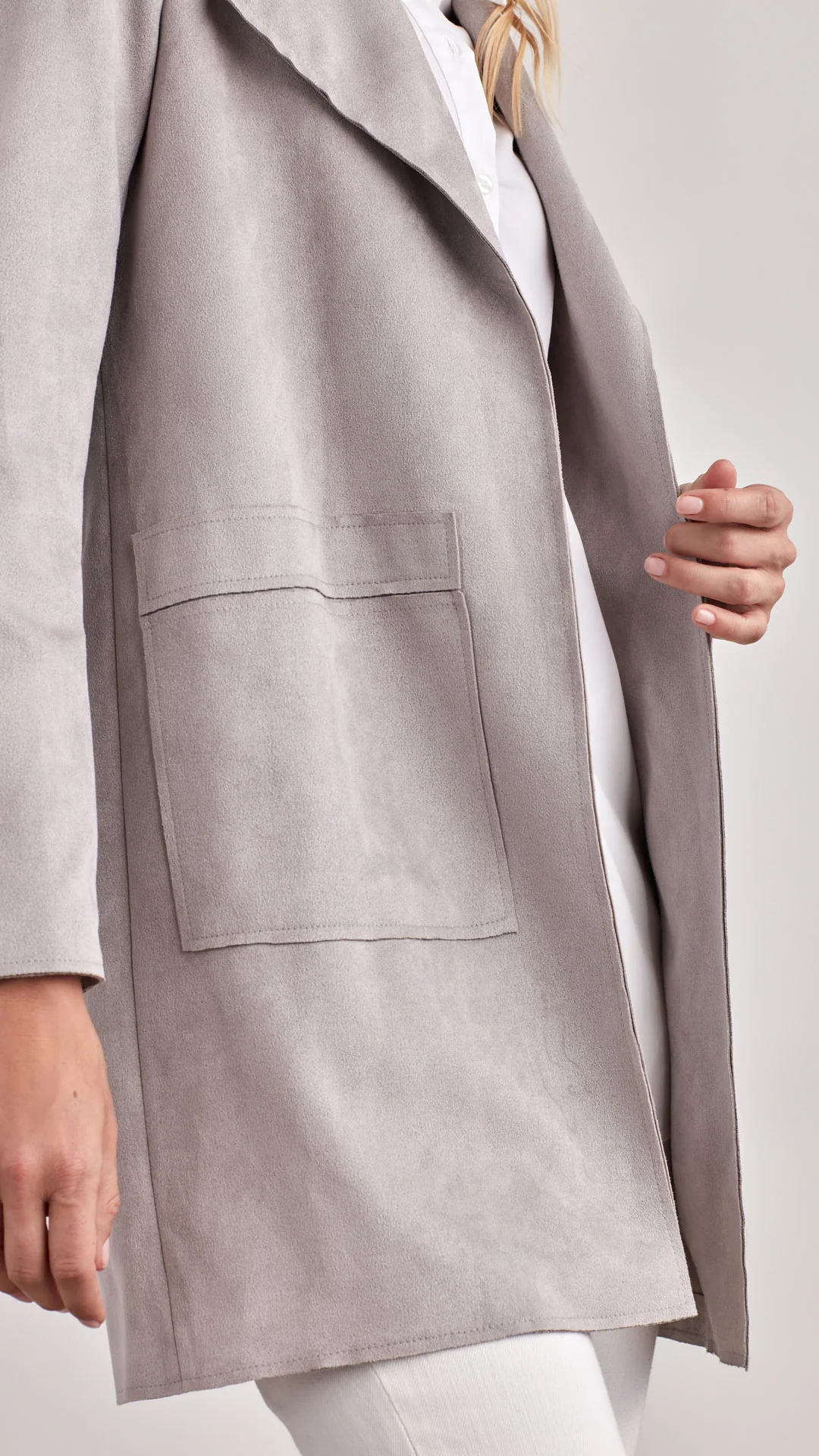 The Faux Suede Jacket has the look and feel of real suede. This chic, timeless, and versatile jacket is the perfect seasonal transition coat. Lightweight and functionality will make this coat your Fall must-have.