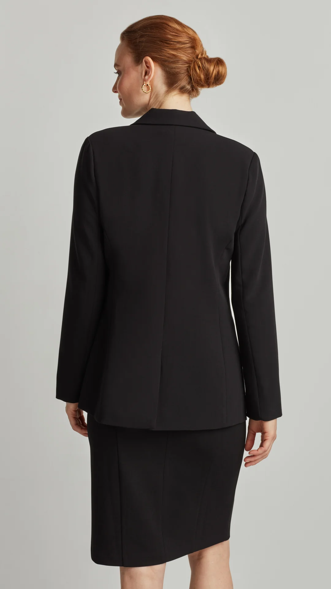 A modern take on the classic blazer, this sophisticated piece features a chic metal clasp closure and princess seams in the front and back for a more feminine fit.