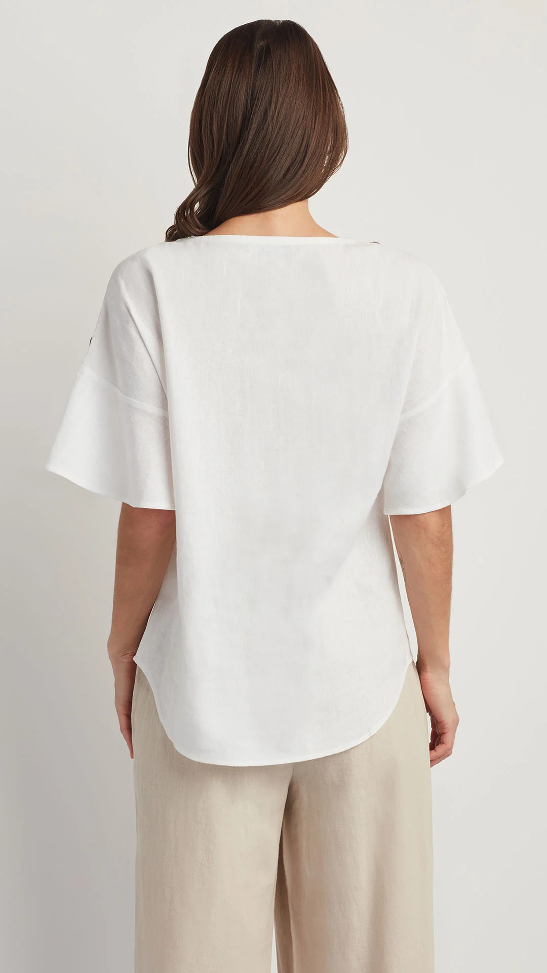 This linen blend shirt has coconut shell button detailing down the dolman sleeve for a fun and flirty look.