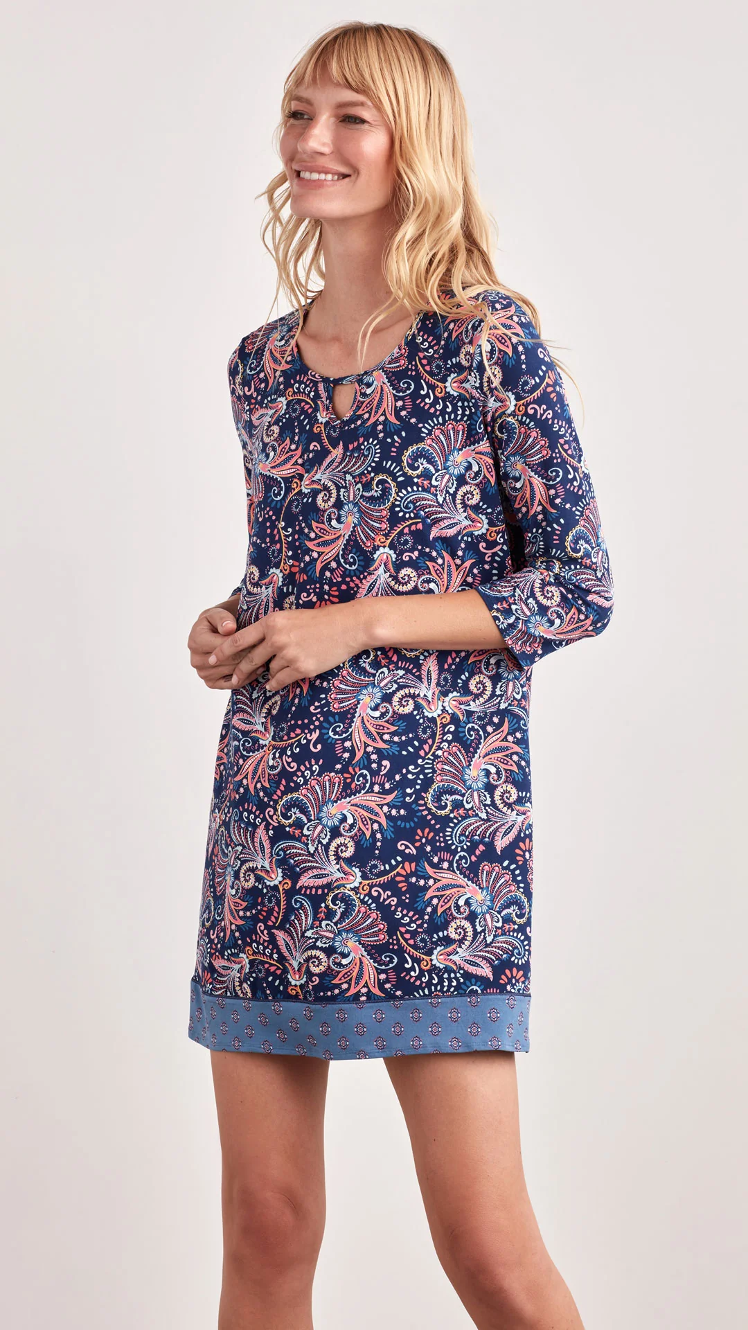 The Ellen Tracy Mixed Print Chemise features a scoop neckline with an attractive keyhole design that adds a touch of stylish intrigue. This pullover sleepwear is made from lightweight fabric, and is perfect pre-sleep relaxation and restful slumber.